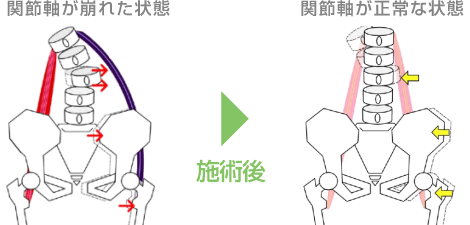 関節軸調整法は、問題になっている患部の状態と、患部と身体全体との連動性を評価し、特に「関節の動揺性」と「筋肉の拮抗バランスの崩れ」を調整することで、筋肉の働きを改善させ、関節の歪みを取り除き、関節軸の正常な動きを取り戻す施術法です。